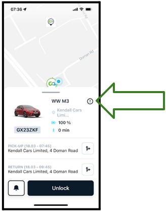 At the start of you hire please click on the information button as shown here (an exclamation mark within a circle to the right of the vehicle name)