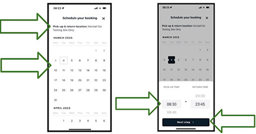 Select the date you want to start your booking and then select the date you want to end your rental. If it is the same day as the start date just click that date twice.