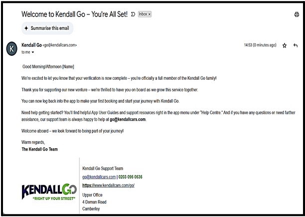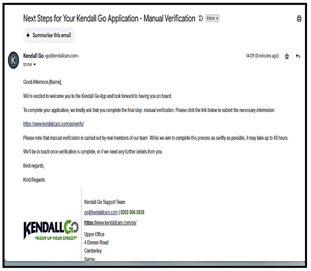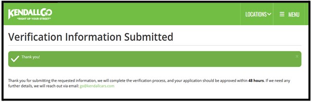 - Please check your email, including your junk box for an email from go@kendallcars.com with the subject header “Next Steps for Your Kendall Go Application – Manual Verification”