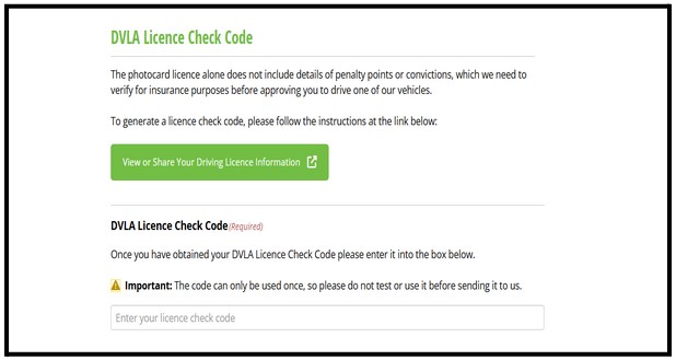 - Next you will need to provide a licence check code. This allows us to check your licence for any point or endorsements